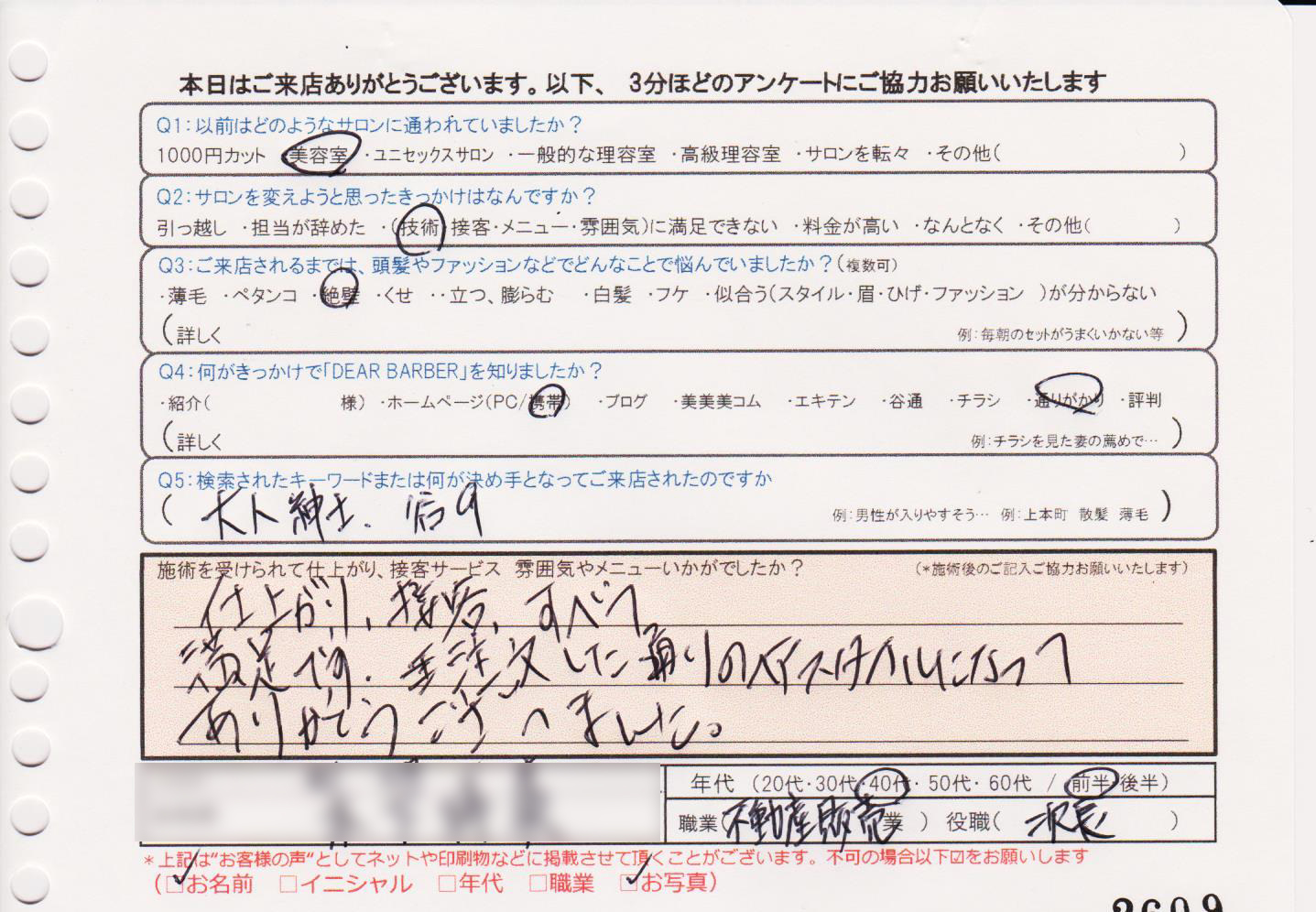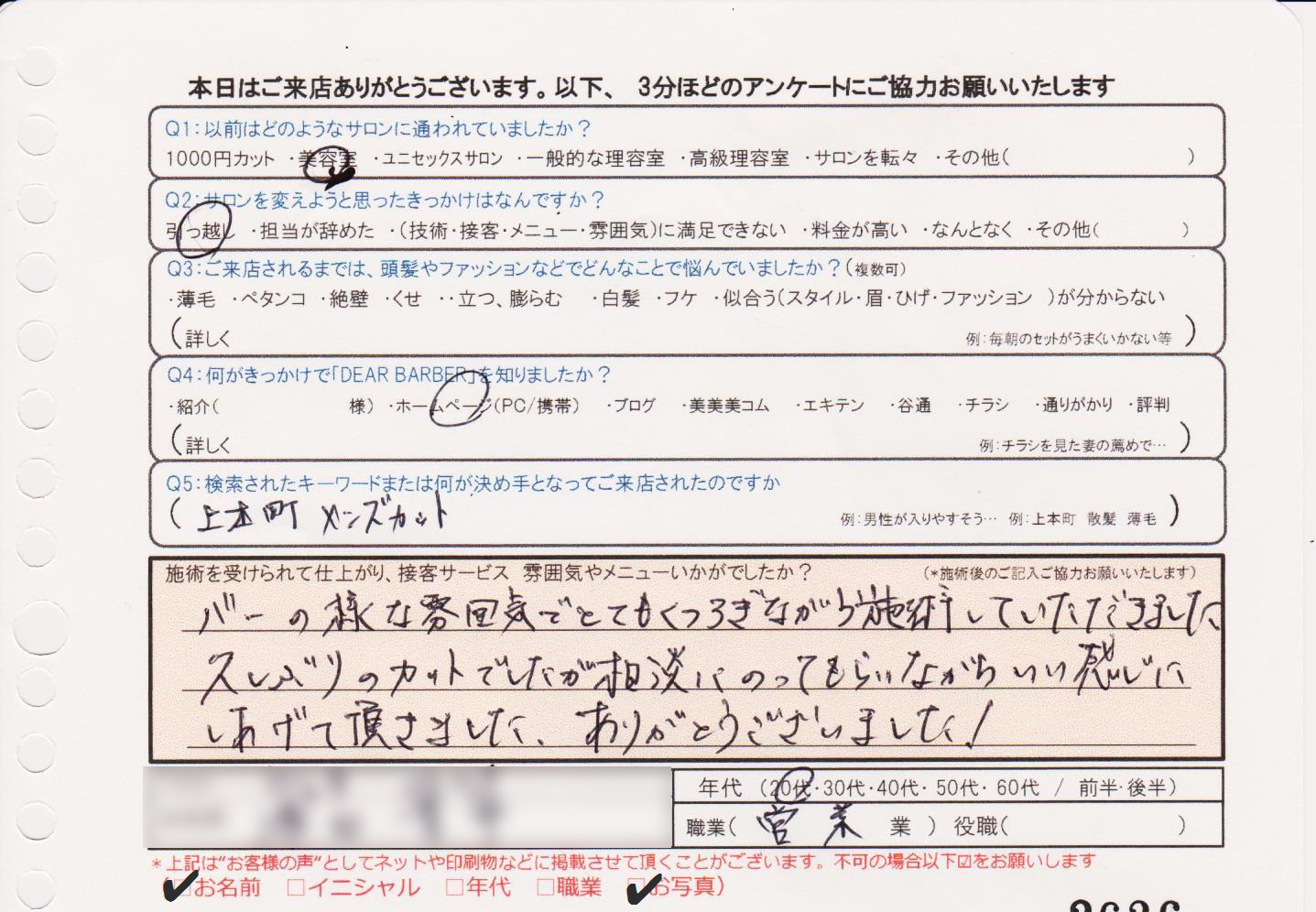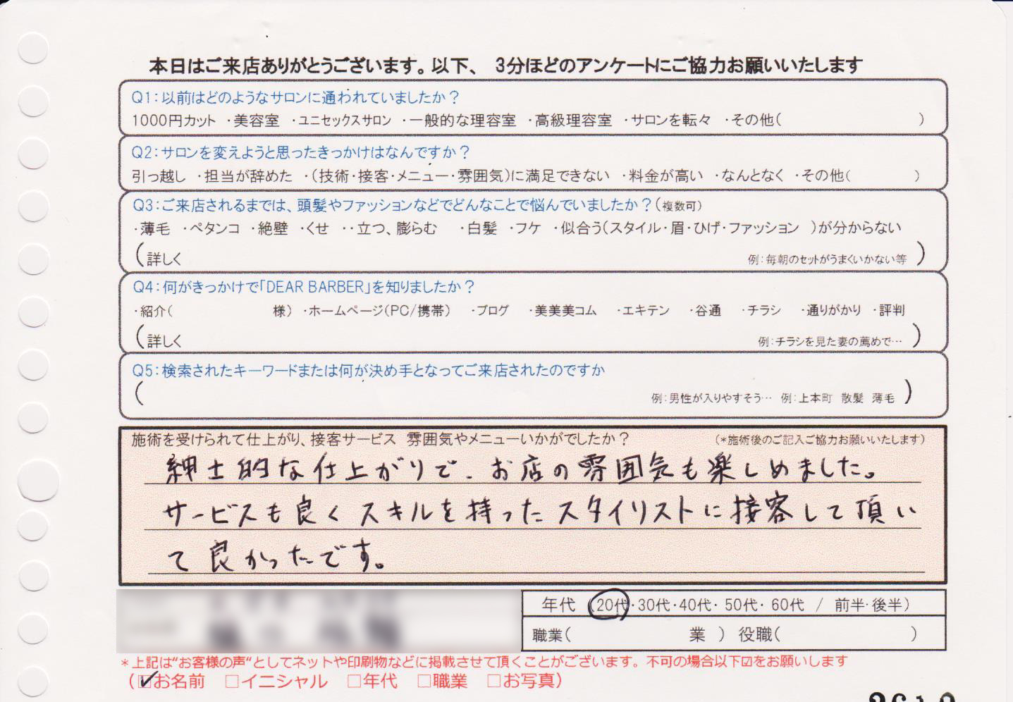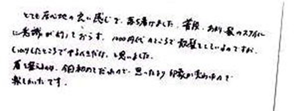 今迄で一番良かったです。カット技術がピカイチで接客も素晴らしく居心地が良かったです。今後共宜しくお願い致します。