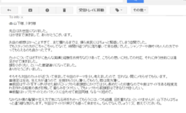先日はお世話になりました。 カットについてはさすがに色んな実績と経験をお持ちなだけあって、こちらの思いに対しての対応、それに伴う技術には満足させて頂きました。 頭を小さく丸く、といった要望通りになってました。 ありがとうございました。 なかなか僕の髪質や生え方で気になる所をわかってもらうにはいつも結構、回を重ねないといけませんが、山下さんはちょっと違う様な気がします。