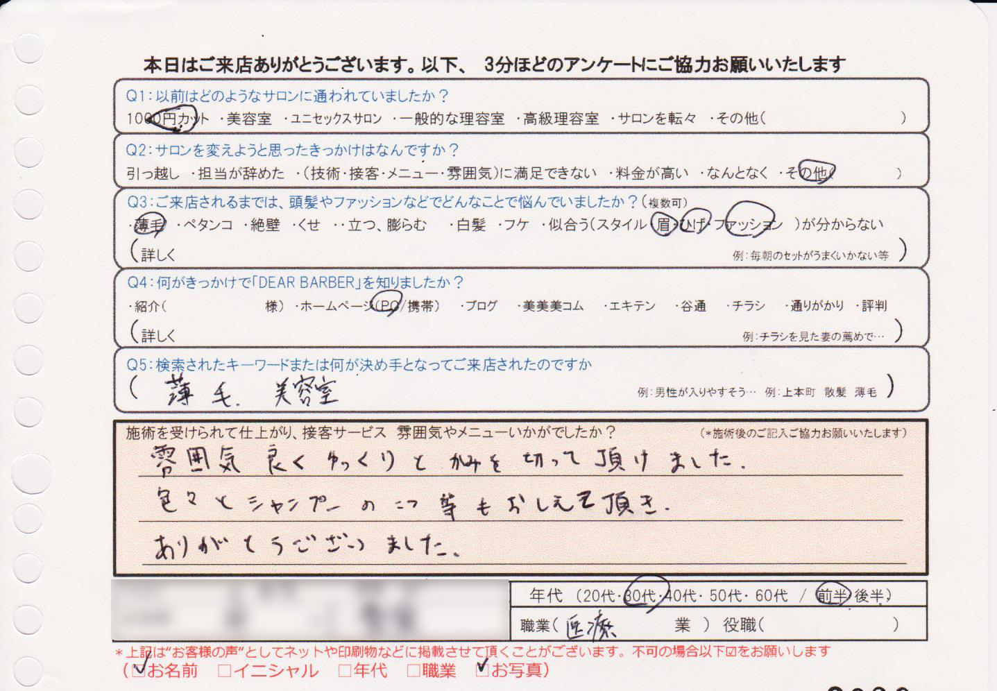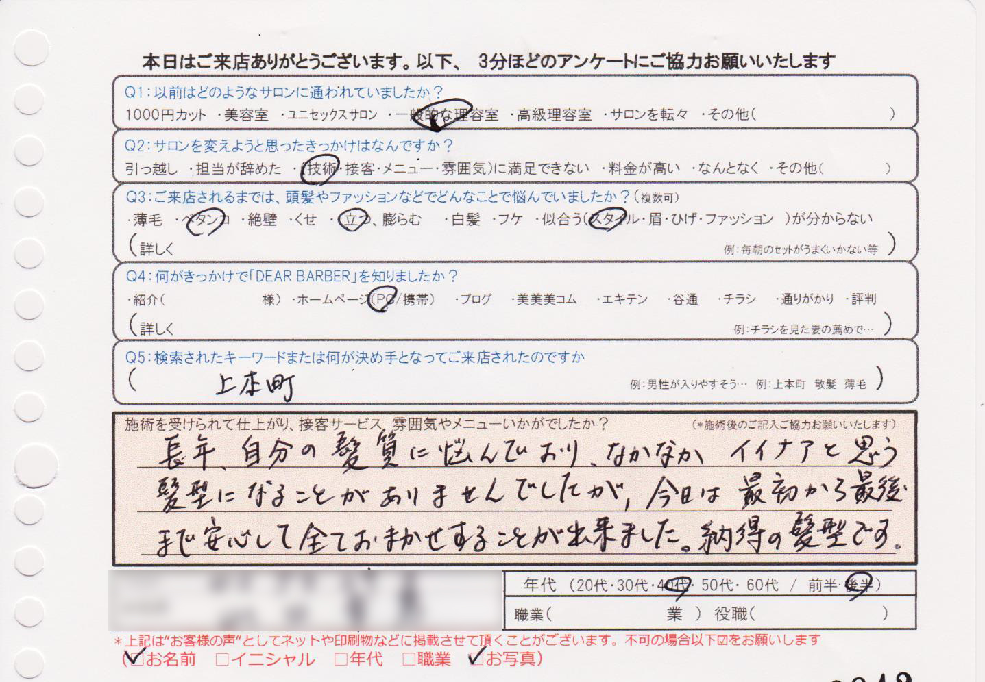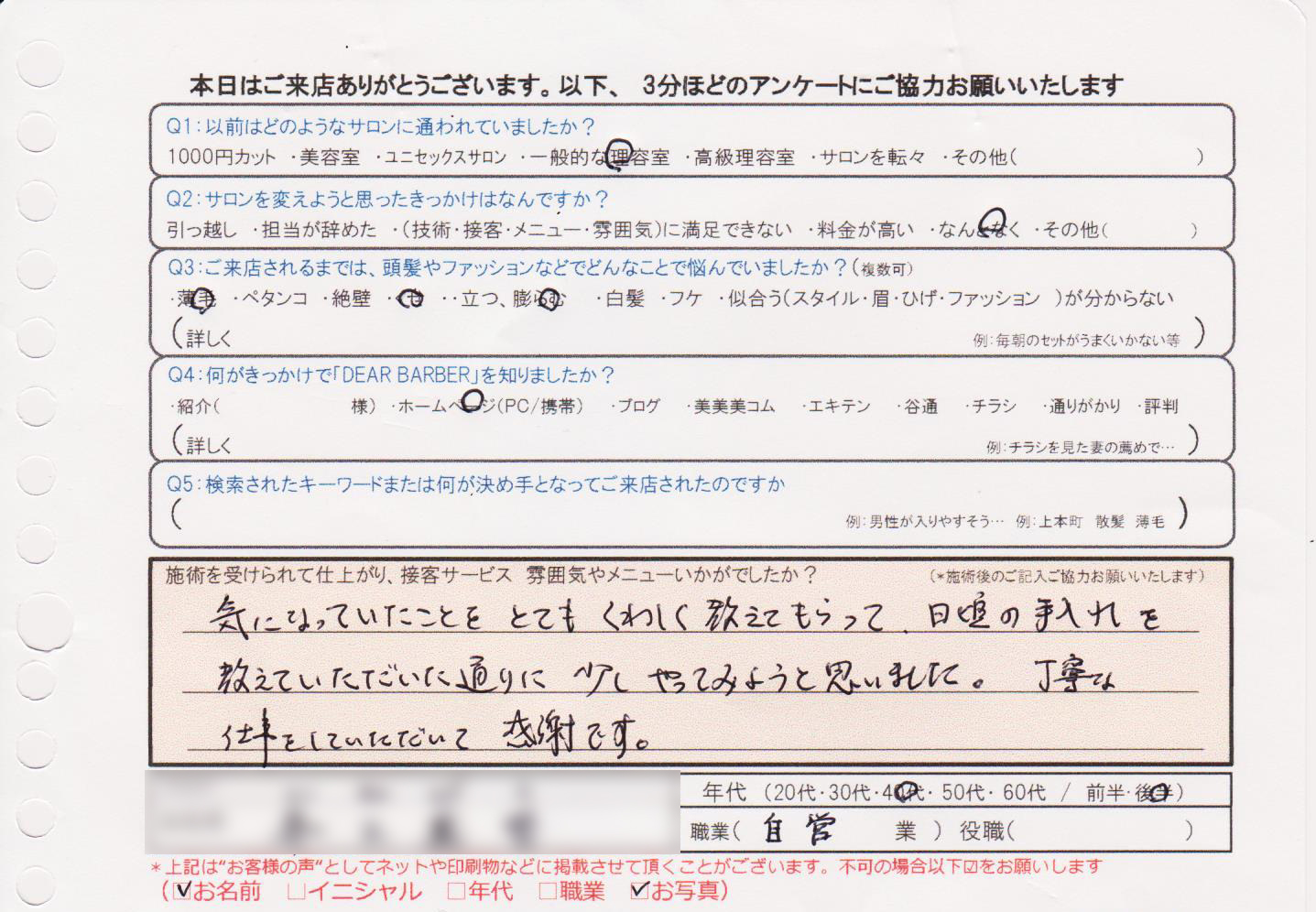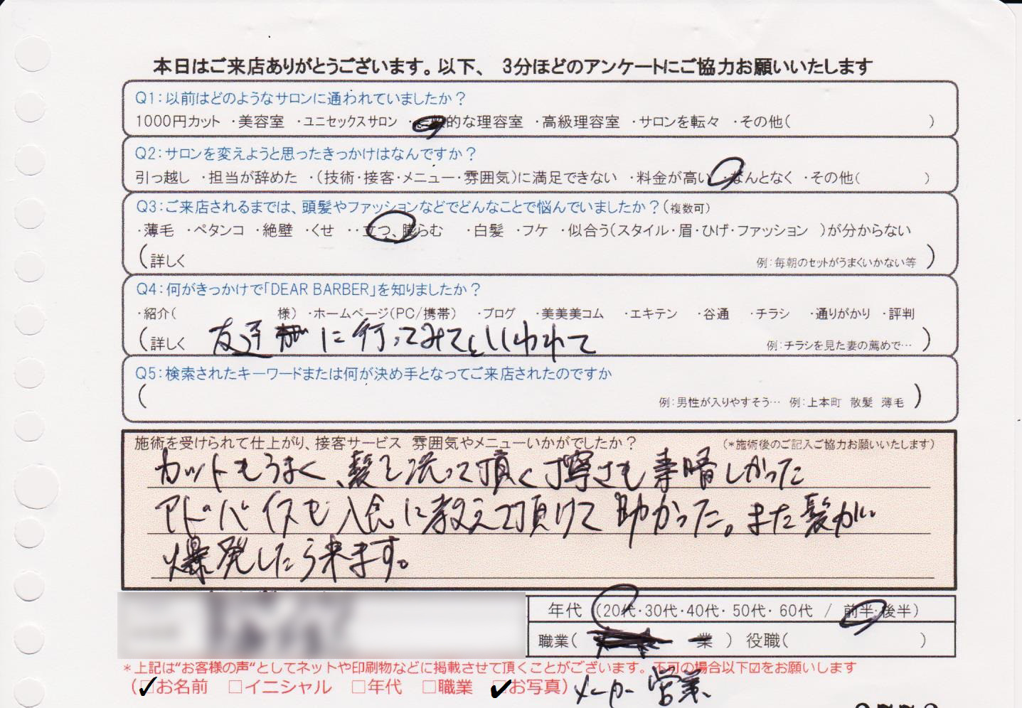長年自分の髪質に悩んでおり、なかなかイイナアと思う髪型になることがありませんでしたが、今日は最初から最後まで安心しておまかせすることが出来ました。納得の髪型です。